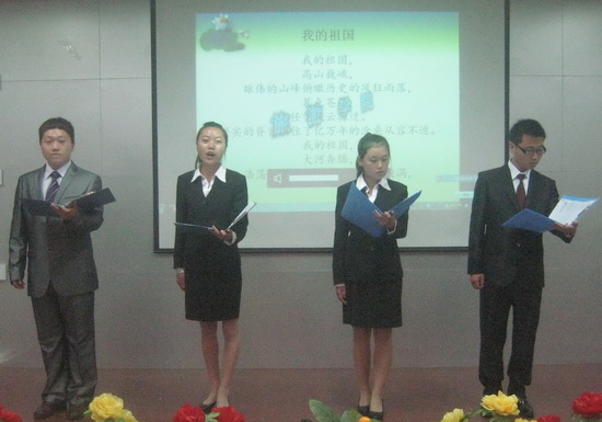 历经2个小时的角逐,旅游学院的王铖、张海琪、刘勇婵、汤凤萍同学以一首深情的诗歌《我的祖国》,最终摘得了本次比赛的桂冠;人文学院的于媛烁、范冉、马玲、康昱�同学、经管学院的徐世伟、王向欢、陈倩同学分获二等奖;电信学院的徐冰汝、王艺博、康婷婷同学、师范学院的吴刚、马红梅、赵小文同学以及政法系的陈聪同学分获本次比赛的三等奖。