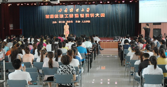 比赛过程为参赛选手每人演讲5分钟,评委现场打分,去掉一个最高分和一个最低分,取五个有效评分计算平均分作为参赛选手的最终成绩。比赛设一等奖2名,二等奖4名,三等奖6名。
