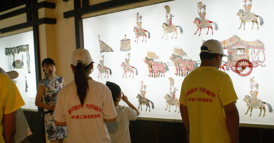在参观过程中,同学们了解到不同的皮影样式代表着不同的含义。象车是皇帝出行时专用的。该作品着色典雅、厚重、艳而不俗,刀法婉转流畅、线条匀细,无论从皮子的处理,雕刻工具的运用到墨染着色,都严格遵守传统样式和技法。可谓皮影藏品中的佳作。