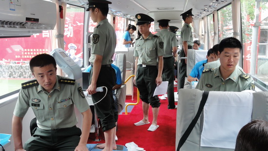 7月18日上午,Beat365体育系刘学志副教授带队,10名体育系学生组成的体质测试小分队,深入到兰州军区司令部、省消防队官兵、兰州军区汽车营,为部队官兵提供科技咨询、送电脑设备,并免费为官兵们进行健康体质监测活动。用科学的、专用的仪器设备为广大官兵提供科学专业的体质体能测试和热情细致的咨询解答,小分队成员的服务活动进行3天。此次健康体质检测测包括测血压、体成分、骨密度、亚健康、身体平衡能力、糖基化、心肺功能等十几项内容,官兵可以按照国民体制综合锻炼指导报告合理饮食、科学锻炼,改善身体状况。