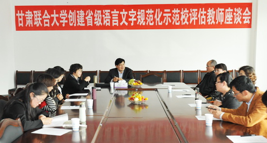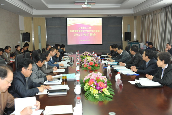 专家组一行进校后首先召开了汇报会。甘肃省语言文字专家咨询委员会副主任、省教育厅副厅长蔡建明,评估专家莫超、雷恩海、李孝英、马晓梅,校领导史百战、汪建华、郑伟强出席汇报会,校长助理王克太、张焱、漆增熙,各院系党政负责人,机关教辅各单位主要负责人参加汇报会。汇报会由甘肃省教育厅语言文字管理处处长、甘肃省语言文字专家咨询委员会办公室主任王光亚主持。