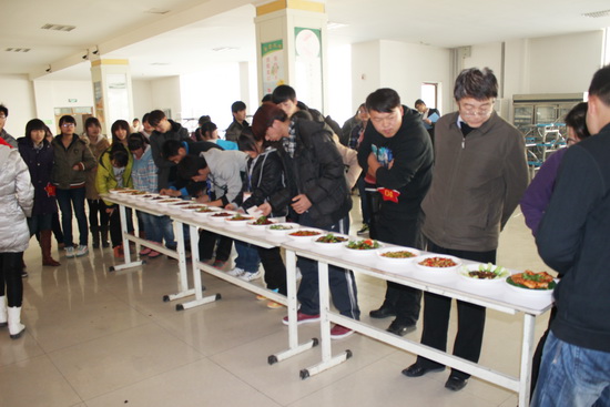 随着主持人宣布比赛开始,选手们便进入操作间化身为大厨,洗,刷,切,剁、煎,炸,煮,炒,一板一眼,有条不紊,刀法精准,动作娴熟,尽显大厨风范。经过选手们的一番精心烹调之后,一道道色香味俱全的菜肴陆续被端上桌,选手们就菜肴的名称、做法、食材搭配及寓意进行了详细的解说,评委们分别从菜肴的外观、质感、味感、营养等方面作出评价,其中特邀评委聚福苑的张忠平厨师针对每道菜肴的优点和不足之处提出自己的建议和意见,并交授选手们如何改进,激励他们再接再厉。赛后,化工学院陈倩老师就本次比赛做了细致专业的点评。