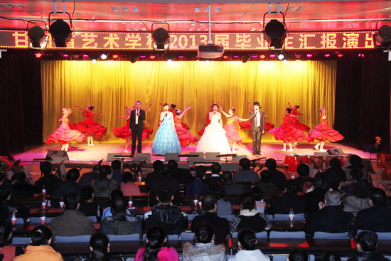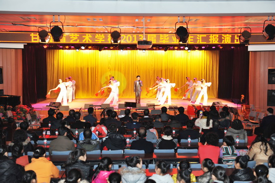 系列活动一:“2013届毕业生汇报演出”。12月27日、28日在思源楼萃文厅举办。该校组织了十七个节目,包括舞蹈、声乐、器乐及舞蹈技巧组合展示等,全面展示了该校的教学成果。27日晚的演出主要是向学生家长和邀请参加毕业生双向选择洽谈会的用人单位进行汇报,演出得到了家长和用人单位领导的好评,演出过程中不时爆发出热烈的掌声。甘肃联合大学党委副书记汪建华,副校长郑伟强、普登学及学校部分单位、部门负责人观看了28日晚上的演出。郑伟强副校长在演出结束后发表了热情洋溢的讲话,对学生们的汇报演出作了肯定,鼓励同学们今后继续努力,为家长争光,为学校争光。