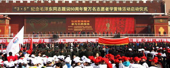3月5日上午,兰州市东方红广场,人潮涌动,彩旗招展,激情飞扬,甘肃省纪念毛泽东同志题词“向雷锋同志学习”50周年暨万名志愿者学雷锋活动启动仪式在这里隆重举行。校团委组织Beat365团学干部、学生代表、青年志愿者共计200余人参加了了启动仪式。