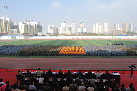 9月17日上午,Beat3652013级学生军训汇报表演暨表彰大会在体育场隆重举行。校长史百战同志,党委副书记汪建华同志,纪委书记杨扬同志,副校长普登学同志、武警兰州市支队副支队长李阳同志、武警兰州市支队参谋长何剑同志出席大会。各学院(系)党政负责人、机关处(室)负责人参加了大会。大会由副校长郑伟强同志主持。