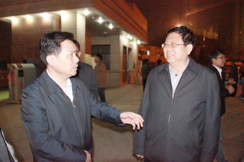 校领导向送水到校的兰州市俞敬东副市长介绍校园供水情况