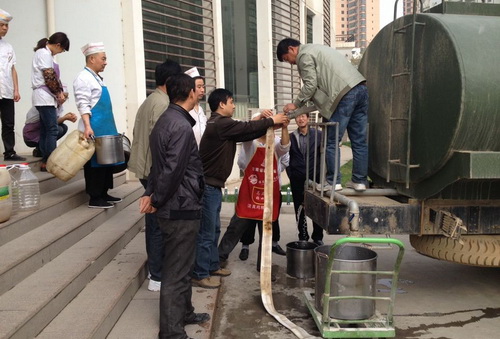 在兰州市的大力支持下,12日凌晨1:00,政府免费提供的1万多瓶瓶装水送到学校;凌晨2:00,送来3车约26吨安全饮用水;上午9:00,送来了4车约45吨安全饮用水。所有瓶装水已发放到全体学生手中,安全用水全部投入到食堂和开水房的供应之中。