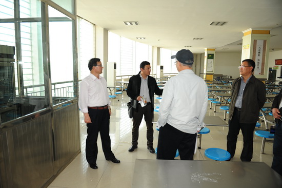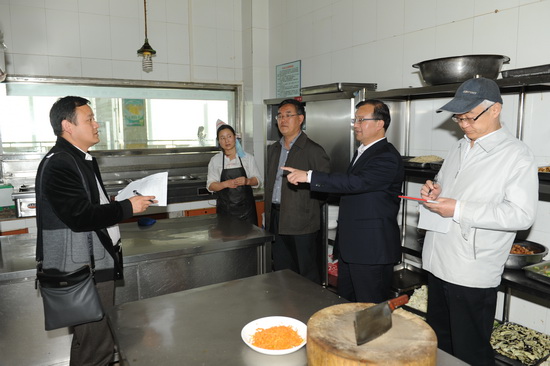 4月15日下午,由省教育厅抽调西北师范大学副校长刘玉泉带队,兰州市食品药品监督管理局、兰州市质量技术监督管理局省教育厅高校后勤改革管理办公室组成的工作组,分别对学校学生食堂的硬件条件、经营品种、饭菜价格、从业人员健康证、粮油米面采购及储备等进行深入检查。校党委书记史百战、副校长郑伟强、后勤管理处领导陪同检查。