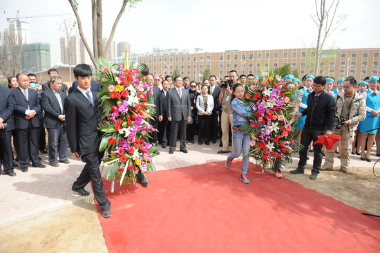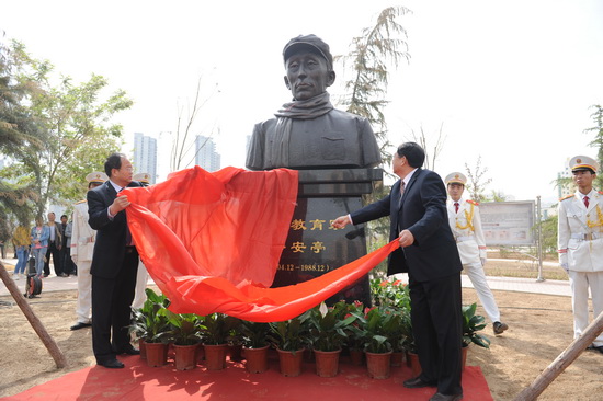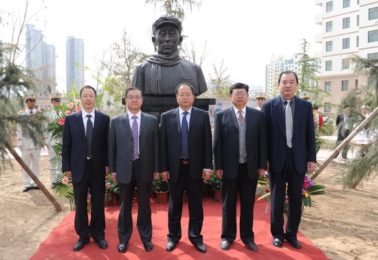 随后,校党委书记史百战,校长汪建华为辛安亭先生铜像揭幕,学生代表为铜像敬献了花篮。