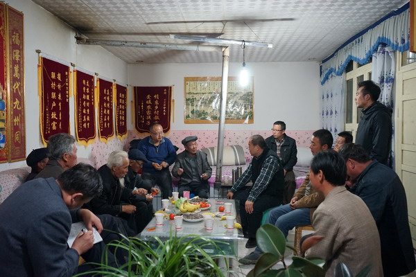 察看打井工程之后,史书记在整修一新的老城村村委会院落里与村民代表一起参加了老城村村委会维修工程落成仪式。同时在新装修好的村委会办公室里召开了老城村贤达人士座谈会,直滩乡党委书记仲乐堂、乡长景荣时、副书记张延奎参加座谈会。在座谈会上,史书记与代表们敞开心扉,谈到农村的过去和现在、农村劳动力的转变、农村的养老问题、农村的空巢现象等一系列农村现实问题。还就村里如何树立致富带头人典型、培养养殖种植能手、共产党员的先锋模范作用、村干部的引领作用等方面正能量的引导和培育,建设文明和谐、积极向上的新农村、新风尚。