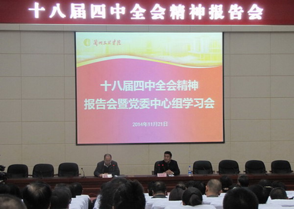 史百战书记在主持报告会时指出,学习四中全会的精神,是当前和今后一个时期重要的政治任务,务必要抓紧抓好。他强调,一要切实抓好四中全会精神的学习,充分认识全面推进依法治国的重大意义,思想上行动上与四中全会保持一致。二要深入学习领会四中全会精神,准确把握依法治国的精神实质,做到学深、学透、学懂,使得依法治国的理念入脑入心。三要将学习四中全会精神与实际工作结合起来,务必把精神吃透、找准着力点,以强化纪律约束为基本前提,认真完成学校赋予的任务,落实“四个再造”,用实际行动贯彻落实四中全会精神,为学校的改革和发展贡献力量。