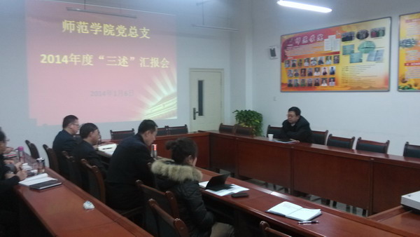 1月6日下午,师范学院党总支2014年度“三述”汇报会在学院会议室顺利召开,党总支全体成员参加了此次汇报会。联系校领导汪建华校长出席了本次会议,会议由师范学院党总支书记赵学森主持。