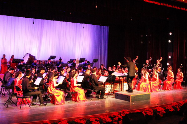 音乐会以交响乐序曲《红旗颂》开场,先后演奏了《白毛女》、《瑶族舞曲》、《金蛇狂舞》、《走西口》主题等民族交响音乐、莫扎特的《钢琴协奏曲》、海顿的《交响曲No.104》,最后以奥芬巴赫的《康康舞曲》结束。