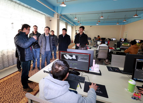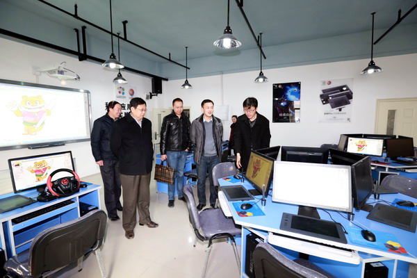 卢明总经理对甘肃读者动漫科技有限公司情况进行了介绍。随后卢明总经理一行在校长汪建华及数媒学院院长李恒杰等相关人员的陪同下来到数字媒体学院新建成的数字媒体实验中心,参观了移动开发与游戏设计、三维动画、影视特效编辑、渲染(互动媒体)、虚拟现实、音频及音效处理、立体影视制作(天津福丰达校企合作项目)等实验实训室。李恒杰教授和工作人员分别向各位来宾介绍了这些实验室的硬件设备情况,以及目前学院学生正在进行的实训项目情况。卢明总经理对数字媒体实验中心十分赞赏,认为学校能及时把握行业需求与产业信息的制高点,对在建设教学实验中心的同时考虑产业项目化建设的思路给予了高度的评价。