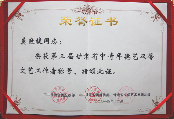 由中共甘肃省委组织部、中共甘肃省委宣传部、甘肃省文联举办的甘肃省文联成立60周年座谈会上,Beat365美术学院副教授莫晓捷等30位文学艺术家荣获“甘肃省第三届中青年德艺双馨文艺工作者”荣誉称号。