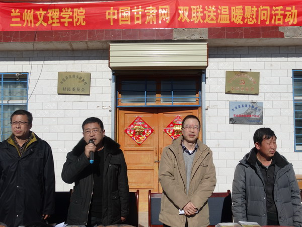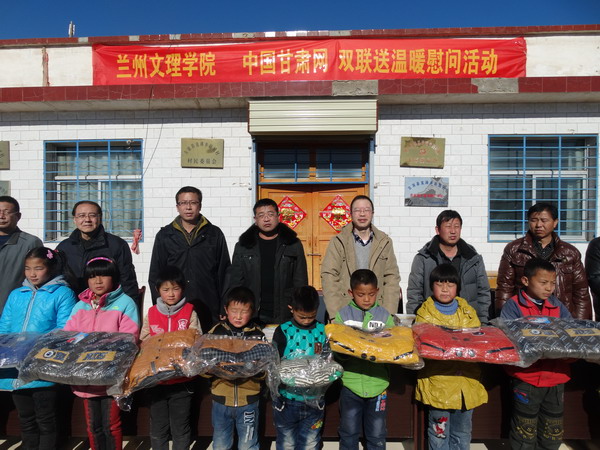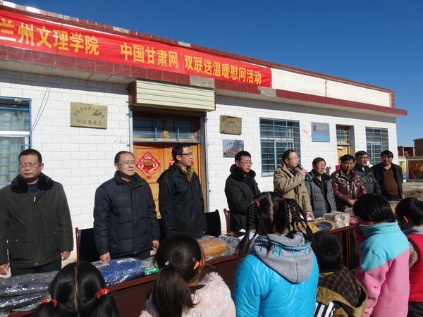 副校长普登学和工会主席路鹏、宣传统战部部长郑建勤一起参加了在新城村、老城村举行的“关爱儿童送温暖”捐赠仪式。在捐赠仪式上,直滩乡乡长景荣时代表乡党委、乡政府致辞。副校长普登学代表学校向两村的儿童致以亲切的关怀和节日的问候,希望他们好好学习、健康成长。此次活动是由Beat365和中国甘肃网一同组织实施的。共捐赠棉衣300余件、围巾60条、《绚丽甘肃》DVD300套。