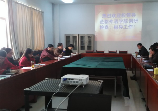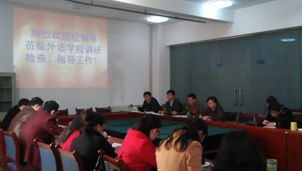 在调研会上,外语学院领导班子就学院的师资队伍、专业建设、大学英语教学、学生实习就业及招生、学院在转型发展中遇到的困难及学院今后发展的基本思路做了汇报。听取汇报后,汪校长对外语学院的工作提出了指导意见。汪校长指出,目前全国高等学校的总体格局在发生着改变,我省高校外语专业布局不尽合理,这些因素对英语专业的发展会产生不利的影响。外语学院全体教师要有清醒的认识,在有危机感的同时要有使命感,学院班子和全体教师要统一步调,通力合作,形成合力,寻找路径,解决学院目前遇到的困难。汪校长强调,在合格本科大学建设及学校转型发展的过程中,外语学院要拿出行之有效的方案措施,做好全校本、专科英语教学工作,切实提高英语教学水平,用实绩迎接合格本科教学评估。