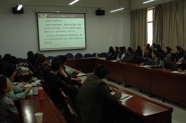 张世成同志代表中专部就2014年主要工作做了总结,对2015工作计划做了汇报。其他班子同志和参会教师就中专部师生的思想、党建、学生管理、师资队伍建设、戏曲专业建设、敦煌舞蹈专业的特色创新以及音乐专业建设和乐队工作等做了发言。