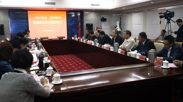 史书记在致辞中介绍了学校的基本情况以及学校贯彻省委省政府13号文件,向文化传媒类高校转型发展建设的基本情况,史书记指出,学校和省广电总台地理位置接近,可合作的领域广阔,合作前景光明,希望双方以此次战略合作协议签署为契机,不断深化和拓展合作领域,为华夏文明传承创新区和甘肃文化大省建设作出应有的贡献。