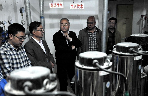 史书记与陪同人员边走边察看物业管理区域环境,与相关科室的工作人员询问物业供水管网情况。首先来到地下车库,史书记察看车库上方各路管网系统结构,对管网暖风系统及暖风管走向一一询问,提出许多专业常识和专业问题,与现场人员进行交流研讨,对地下车库冬季室内温度情况交换了意见。史书记与大家边走边察看,上到主楼负一层管道层,察看给排水、消防管道,强弱电系统。看到供水泵系统时,史书记对楼层高区供水、中区供水的定额功率、水压、管路方向等方面一一询问;对公寓楼1、2层水压低供水问题提出了利用中区供水压差的原理进行改进低区低压供水问题的建议方案,在核算泵压值论证是否够用、选择好的减压阀等方面提出了工作要求。
