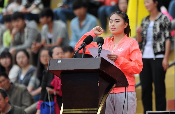 裁判员代表和运动员代表郑重宣誓后活动进入文艺表演环节,梅花桩舞狮、龙腾双节棍、啦啦操等精彩表演将活动推向高潮,他们出色的表演赢得了观众席上的阵阵掌声。