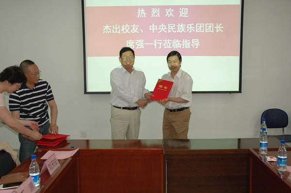 6月9日下午2点30,甘肃省艺术学校杰出校友、中央民族乐团团长席强一行来到实验剧场,在相关同志陪同下观看了甘肃民间艺术展演活动,并愉快接受了Beat365唯一官方网站特聘教授的聘任。