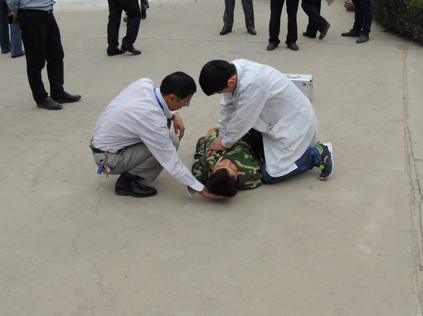 2015年9月15日下午16时45分,由演练总指挥魏建明同志宣布活动准时开始。北校区10号学生公寓突发“火情”,学生拨打校园报警电话报告,保卫处接报后,立即通知相关部门启动火灾事故应急处置预案,各应急小组成员迅速赶赴现场。公寓值班人员快速打开安全疏散通道,通知电工断电,水站加压供水。各楼层负责军训教官第一时间到达各自预定执勤岗位就位,在宿舍各楼道、楼梯位置做疏散指挥工作。听到警报后,同学们迅速离开宿舍,按照安全转移路线和要求,用湿毛巾、袖口捂住口鼻,低身有序撤离危险区域并在安全位置集合。在集合点,疏散人员根据军训区队划分集合整队,清点人数并报告学生处,确保全体同学均已安全转移,并向演练总指挥汇报。医疗救护组人员在集合点对“受伤人员”进行紧急救治。