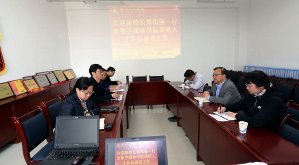 2016年3月30日上午,郑伟强副校长一行前往数字媒体学院调研人才队伍建设工作,人事处处长郭萍、人事处副处长卢志辉陪同调研,数字媒体学院领导班子成员,部分教研室主任、教师代表参加调研会。 会上,数字媒体学院院长李恒杰教授汇报了学院师资队伍、专业建设与人才培养方案的基本情况及面临的主要问题。学院党总支书记陈小琴汇报了数字媒体学院在学院管理队伍建设方面的问题,建议学校制定应用型人才评价体系与人才激励机制。教师代表马少斌老师建议以项目为龙头,加强师资团队建设。 郑伟强副校长在听取有关意见和建议后,首先肯定了数字媒体学院在校企融合、产教融合培养应用型人才方面的工作走在全校前列,并就各专业建设存在的问题分别提出指导意见。随后,针对今后工作的开展,郑伟强副校长指出:一是在专业建设方面,树立“大学科”招生、授课观念,高效利用现有师资与物资力量;二是在教师人才队伍建设方面,进一步发挥校企融合作用,提升教师工程实践能力,通过教学名师培养、教学改革、课程建设,三位一体构建教师团队;三是人才培养方面,多管齐下注重学生的自学能力、可持续发展性和创新实践技能的培养;四是发挥学院现有师资自身优势做好教师转型工作,提升整体教学平台。最后,郑伟强副校长希望数字媒体继续加大课程改革,加强校企融合和学科竞赛力度,通过创新促发展,为学校转型发展作出积极贡献。 (撰稿:赵�媛 摄影:高毅)