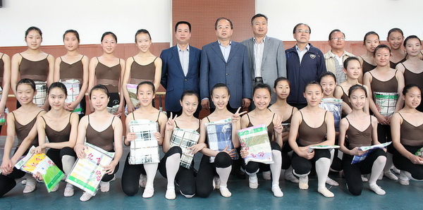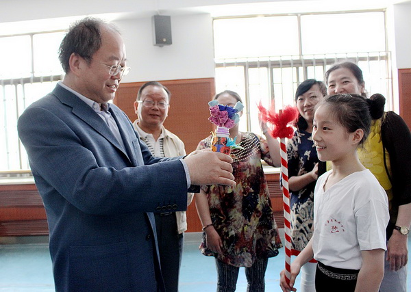 随后,史百战书记一行来到三号功厅,2014级戏曲班正在上腿功课,同学们看到史书记到来高兴地问候。史书记细心聆听了授课老师对班级情况的介绍,并与孩子们进行交流,代表学校祝大家节日快乐,并发放了小礼品,参加全国戏曲“小梅花”奖比赛的学生何嘉艺向史书记一行进行了专业展示,史书记对孩子们的进步给予了肯定,对老师们辛勤的培育表示了感谢,学生代表向史书记赠送了同学们亲手制作的手工品,史书记愉快的接过手工品并和同学们合影留念。
