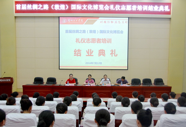 7月12日下午,首届丝绸之路(敦煌)国际文化博览会礼仪志愿者培训结业典礼在学术报告厅举行,校党委副书记普登学出席,旅游学院党总支书记李耀荣、党委宣传部副部长贺志军、担任本次培训工作的旅游学院张晓玉、殷姿、吴昱群、赵爱婷、梁莉春、牛晓春等老师以及全体参训礼仪志愿者参加。校团委书记孙亮主持结业典礼。