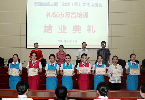 会上,校团委书记孙亮对首届丝绸之路(敦煌)国际文化博览会礼仪志愿者培训工作做小结,旅游学院张晓玉老师宣读了拟确定参加丝绸之路(敦煌)国际文化博览会礼仪志愿服务人员名单,与会领导为结业学员代表颁发结业证书。