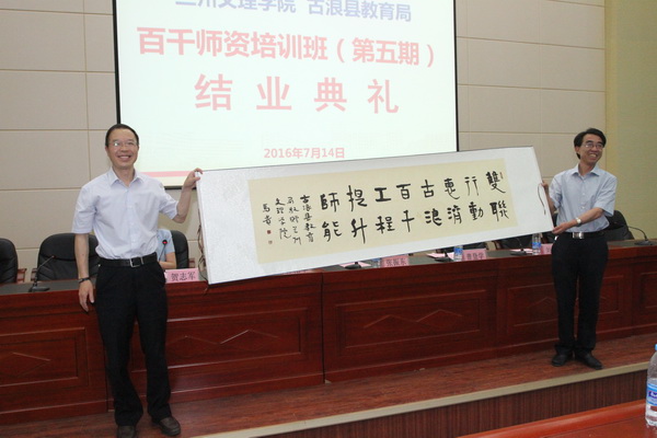 随后,古浪县委、县政府向Beat365赠送内容为“双联行动惠济古浪,百千工程提升师能”的书法作品以作纪念。培训班学员代表发表了培训感言,古浪县县委宣传部长林艳军同志和Beat365党委副书记普登学同志,分别就百千师资工程培训做了总结讲话。