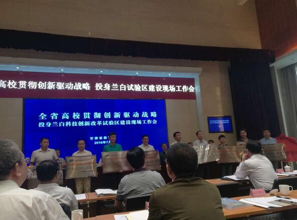 日前,全省高校贯彻创新驱动战略投身兰白科技创新改革试验区建设现场工作会在新区召开。会上,郝远副省长为兰白科技创新改革试验区联合创新研究院揭牌,并为第二批省级“2011协同创新中心”、首批“甘肃省高校电子商务重点实验室”授牌。