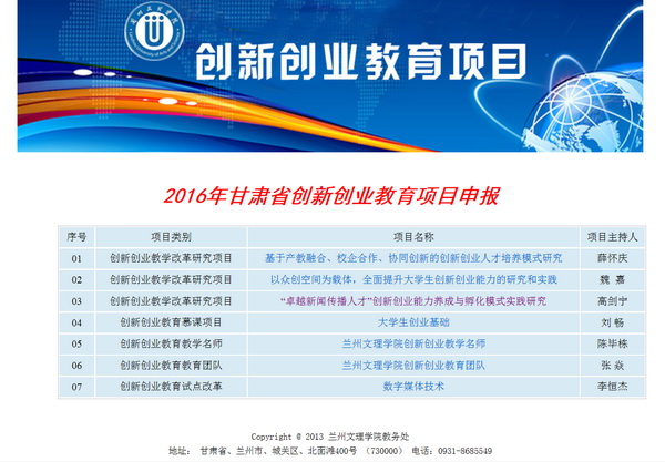 根据《甘肃省教育厅关于做好2016年度高等教育内涵发展――创新创业教育项目申报工作的通知》(甘教高函〔2016〕42号)精神,教务处、人事处组织校内招生就业处、信息中心及13个学院积极申报、评审、网页制作,共申报创新创业教育教学改革研究项目3项,创新创业教育慕课1门,创新创业教育教学名师1名,创新创业教育教学团队1个,创新创业教育试点改革专业1个,教务处于8月10号按时完成相关文件材料的上报工作。