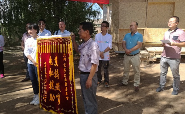 县湾村小学校长李宏杰代表受赠方发言,并接受了捐资方的授牌,同时他代表学校为三家捐资方赠送了锦旗。