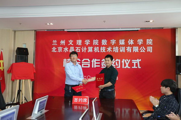 在签约仪式上,数字媒体学院院长李恒杰教授和北京水晶石计算机技术培训有限公司张键铖总经理分别代表双方签订了合作协议,发表了热情洋溢的讲话,都表示今后将在教学管理及教学模式;实训、实习、就业;师资互派及挂职交流;产学研用等方面全方位进行深度的校企融合。