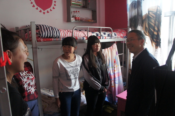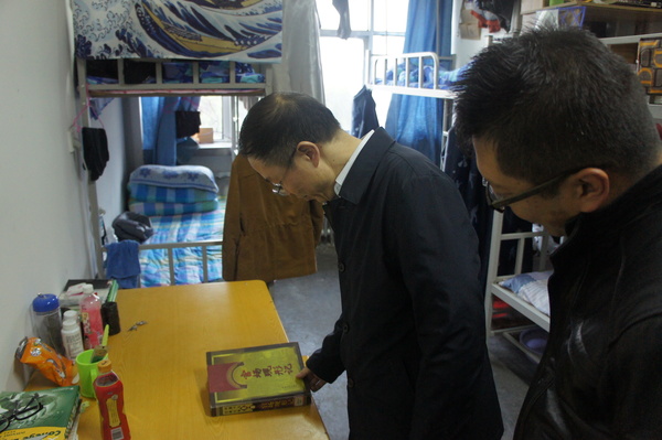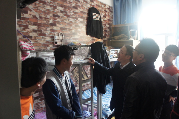 在7号楼女生宿舍,普副书记查看了宿舍用电、供暖设施状况,并亲切询问了大家的日常生活习惯与作息安排,希望大家多读书、多锻炼,培养健康的生活习惯;希望大家尽早确立自己的学习目标和就业方向,并制定计划付诸实施,为将来走向社会打好基础。