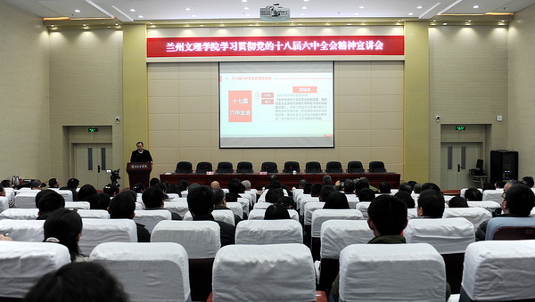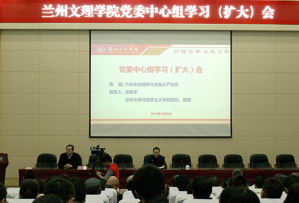 2016年12月9日,学校召开党委中心组学习(扩大)会。邀请兰州大学马克思主义学院院长,博士生导师张新平教授作了题为《六中全会精神与全面从严治党》的专题报告。参加学习会的人员有校院两级中心组成员,正高职称人员、各民主党派负责人和无党派代表、副处以上干部、马克思主义学院部分教师。报告会由校党委副书记普登学主持。