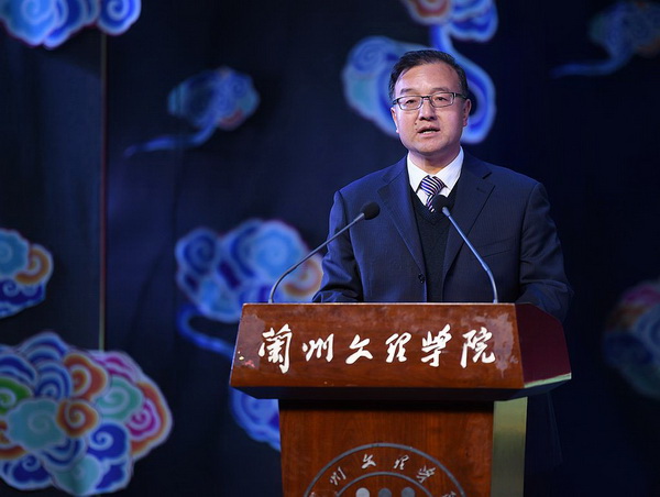 校党委副书记普登学为文博会礼仪志愿者服务队颁奖