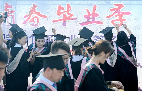 典礼开始前,参加典礼的校领导、学位评定委员会成员以及嘉宾与全体本科毕业生合影留念并在毕业签名墙上签名后,在暖场视频的祝福声中入场。