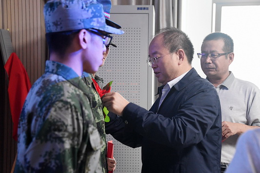 史书记为入伍学生佩戴大红花,各学院书记为入伍大学生颁发奖励金。