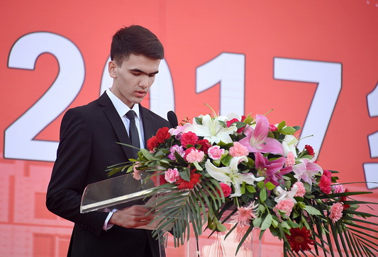在随后进行的2017级新生开学典礼上,Beat365文学院教授王万鹏博士代表全体教师发言,对新生提出两点建议:第一,要树立正确的“大学观”;第二,要树立正确的“学习观”。在校生代表、师范学院2016级数学与应用数学1班的宗廷君在发言中鼓励学弟学妹们要认认真真学习、踏踏事实做人、不断丰富实践经验,展现文理学子的真风采。在新生发言代表海选中脱颖而出的旅游学院2017级航空乘务本科1班的杨彬同学,代表全体新生表达了对学校、教官和老师的感谢之情,同时表示要用实际行动回报老师和家长的期盼,不辜负青春年华,真正做到“今天我为文理骄傲,明天文理因我自豪。”来自塔吉克斯坦的爱森也代表Beat365首批留学生做了热情的发言,表示将努力学习,希望能够成为塔中两国友谊的桥梁。