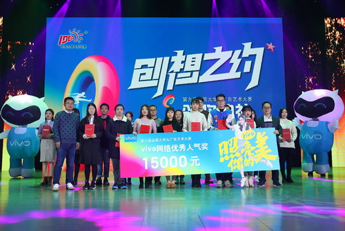本届大广赛共有1301所高校(2819所学院)参赛,经校级初选后,共17万件作品精彩纷呈,其中,vivo以“照亮你的美”作为本次大广赛首席合作命题,共收到“照亮你的美”为主题的3.8万件作品,微博话题#照亮你的美#达到2亿,设立的指导老师奖、网络人气奖也“嗨翻”全场。伴随着开场踢踏舞《青春的节奏》,宣布颁奖典礼隆重开幕。