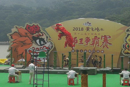 “黄飞鸿杯”狮王争霸赛是世界狮艺界传统的体育文化赛事,被誉为世界顶尖狮王争霸赛,称为世界狮王的NBA与超级狮王联赛。2018年4月29日至30日,“ 2018黄飞鸿杯”第十二届全国南北狮王争霸赛暨水上双狮挑战赛在美丽的广东省佛山市西樵山天湖公园举行。本次比赛由国家体育总局社会体育指导中心、中国龙狮运动协会、广东省佛山市南海区文化体育局、南海区西樵镇人民政府联合主办,南海区西樵山风景名胜区管理处、南海区武术龙狮体育协会共同承办,共有来自世界各地的19路狮王上演巅峰对决。