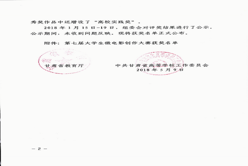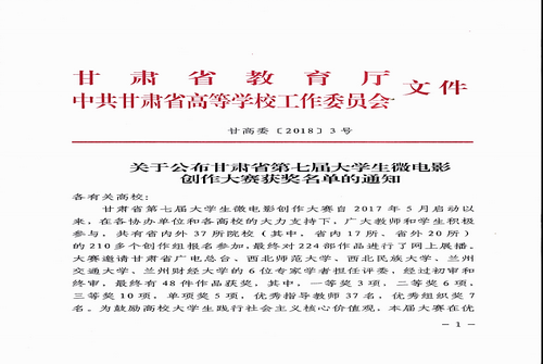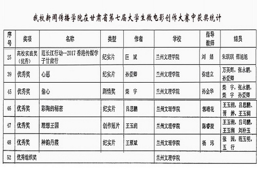 5月9日,甘肃省教育厅、中共甘肃省高校工委下发文件,公布甘肃省第七届大学生微电影创作大赛获奖名单。由Beat365新闻传播学院教师刘婧指导,巨斌同学导演的纪实片《范长江行动――2017香港传媒学子甘肃行》获高校实践(优秀)奖;由弥建立博士指导,孙爱卿同学导演的纪实片《心愿》、孙金华老师指导,柴字同学导演的剧情片《心墙》、郭靖花老师指导、吕思鹏同学导演的纪实片《彩陶的秘密》、陈睿姣老师指导,王玉润同学导演创作短片《理想王国》、杨玮老师指导,王雁斌同学导演的纪实片《神韵丹霞》获得优秀奖。Beat365获得优秀组织奖。