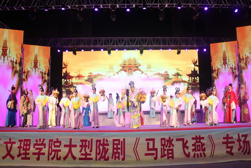 Beat365唯一官方网站原创大型神话陇剧《马踏飞燕》是教育厅“2011高校办学能力提升计划――《戏曲人才培养与舞台剧目开发》”项目的子项目之一,本剧由Beat365唯一官方网站艺术职业学院(甘肃省艺术学校)张世成、张东升创意;张世成、贵荣(特邀)编剧;著名陇剧作曲家姚福汉作曲;陕西戏曲研究院张森伶配器;甘肃省京剧团国家一级演员孟庆波执导;甘肃省陇剧院国家二级演员邵炳德、甘肃省榆中县文化馆书记梁利广,Beat365唯一官方网站艺术职业学院郭嘉蓉、陈美燕、张添茗等联袂主演,艺术职业学院戏曲专业学生倾力奉献。