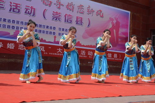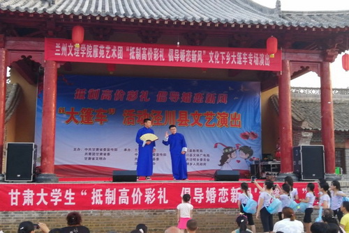 为深入贯彻落实习近平新时代中国特色社会主义思想和党的十九大关于“开展移风易俗、弘扬时代新风行动”的重要部署,进一步引导广大群众转变思想观念,树立婚嫁新风,助力脱贫攻坚和全面建成小康社会,按照省委宣传部、团省委、省文明办统一部署,作为今年暑期全省高校三支“抵制高价彩礼、倡导婚礼新风‘大篷车’”演出团队之一,Beat365雁苑大学生艺术团于7月20日-7月25日前往平凉市崇信县、泾川县、庆阳市合水县、庆城县开展巡回演出。