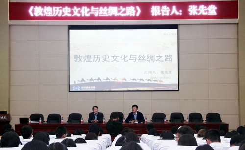 在《敦煌历史文化与丝绸之路》的主题报告中,张先堂首先通过对历史英雄张骞的讲解,结合敦煌在古代的地理位置以及莫高窟的兴衰,向同学们讲述了敦煌石窟的盛衰与丝绸之路的兴废历程,生动形象的描述了敦煌文化的发展,并向勉励全体数媒学子:现在是数字化时代,博大精深的敦煌文化亦是古人技术、艺术、宗教信仰的综合体现,要全方位保护和发扬敦煌文化,就必须和媒体技术所结合,就必须通过媒体艺术所表现。其次,张先堂研究员结合敦煌研究院的考古研究,向同学们讲解了敦煌石窟艺术与丝绸之路中西文化的交融与发展,以莫高窟中位敦煌石窟中的代表,讲述了藏经洞的发现以及敦煌学的诞生。并向同学们展示敦煌文化中的壁画等艺术作品,启示同学们可以通过自己所学的专业去传承敦煌文化,并用敦煌文化去创新技术,将敦煌文化与技术专业结合创新学习,发展具有自己特色的中国数字文化,例如通过虚拟现实技术还原壁画场景等。