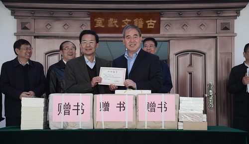 在图书馆举行的省政协文史资料赠书仪式上,省政协文史资料和学习委员会张正锋主任作了讲话,邵明副主任代表省政协文史资料和学习委员会向Beat365赠书,校长刘仁义代表学校接受赠书并致感谢辞,仪式由副校长郑伟强主持。