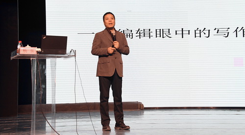 讲座伊始,杨葵先生欲扬先抑地从清朝著名学者纪晓岚的对联开始讲起,引出了写作的内涵和分类,明确指出写作不只是作家的事,每个人都在日常表达中写作。通过鲜活的案例让我们更深入的了解了写作的技巧和精髓。接着杨葵先生又引用《论语》的“绝四”和傅山的“四宁四毋”来讲写作的立意,写作不贴标签,篇幅当长则长,当短则短等。他还将写作比喻为对“玉石”的鉴赏,通过“六德”和“三贱”来告知大家写作“好”的标准是什么。最后,杨葵先生指出写作讲究的是趣味,通过他的编辑经历和写作经验让大家明白了“逗与趣”对写作的重要性,“初谓极,中则过”,写短句,写短文,少用副词、名词和动词才能写出好文章。